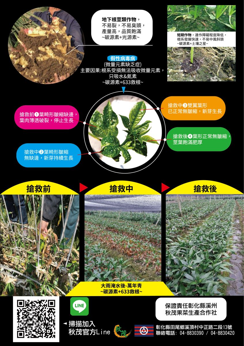 解救土壤碳飢渴(過施化肥、有機質不足、土壤酸化鹽化、土壤板結硬化等)&根系受損(連作、肥傷、澇傷、病害等)之生長障礙(假瘋欉、假性病毒病、微生元素缺乏症等