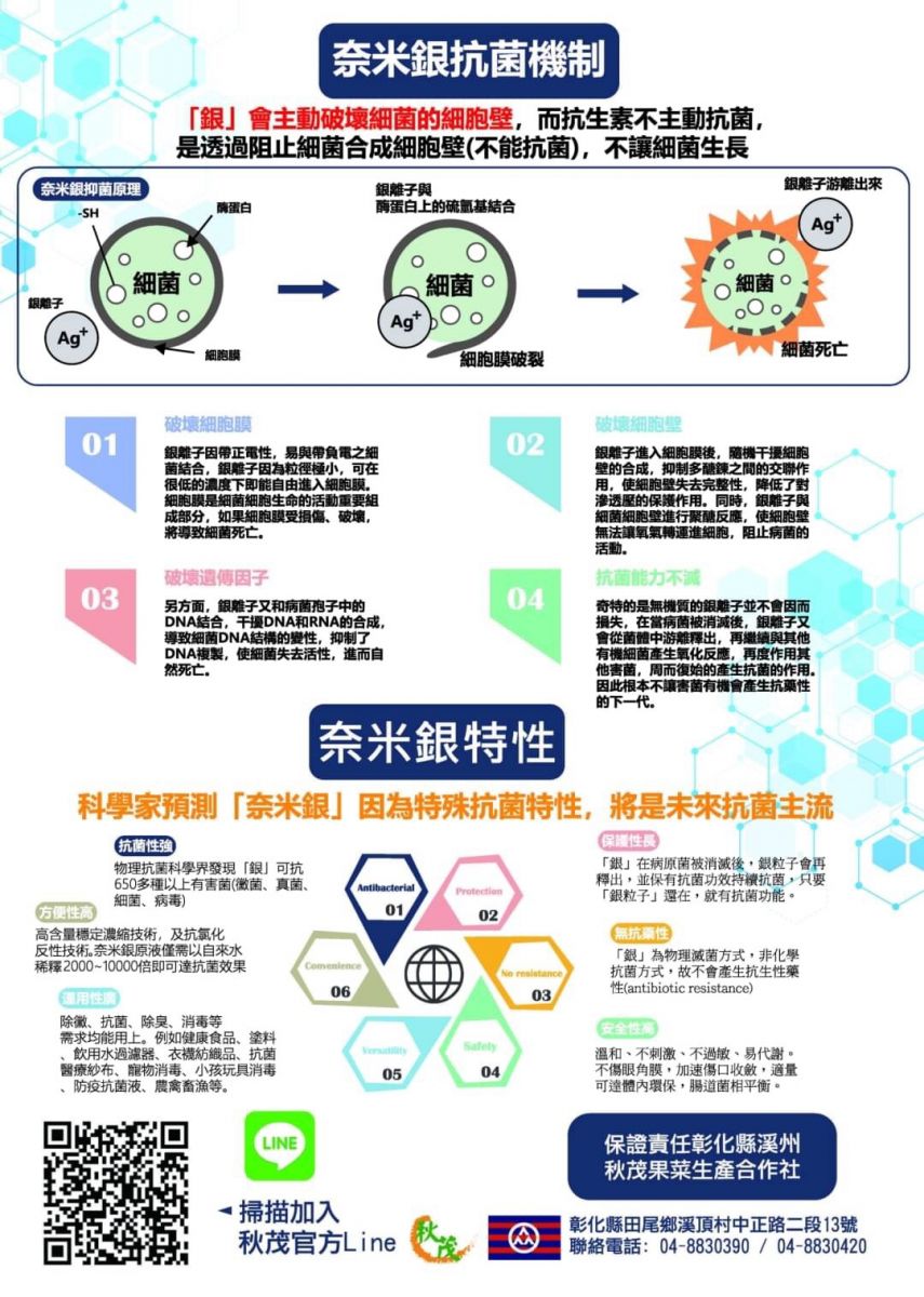 奈米膠體銀,在國外做為人體健康食品飲用,相對安全,對於細菌、真菌、病毒等,均有相抑制作用。以金屬離子殺菌(例如、銅、鋅等)能力而論,銀離子活性更為活潑,自然殺菌力更加顯著。不產生抗藥性、高效、廣普、安全、無味、不刺激、不過敏。秋茂專利製程使其不易產生布朗效應沉澱而失效,可與大多數化學藥劑混合。高濃度濃縮,用量少即可達抑制效果。