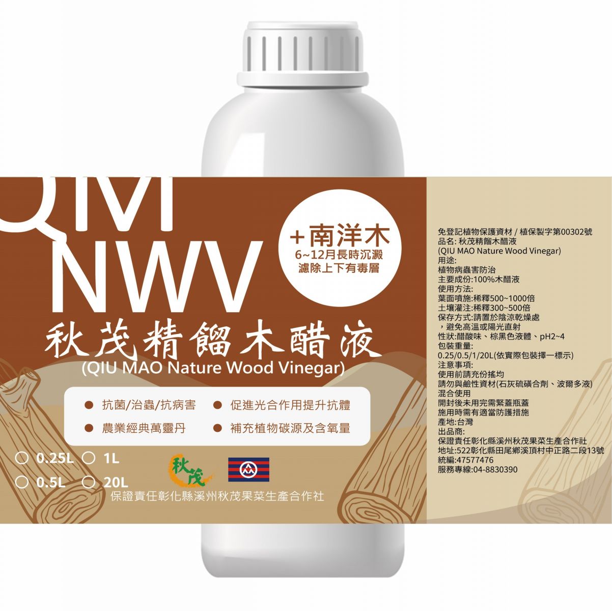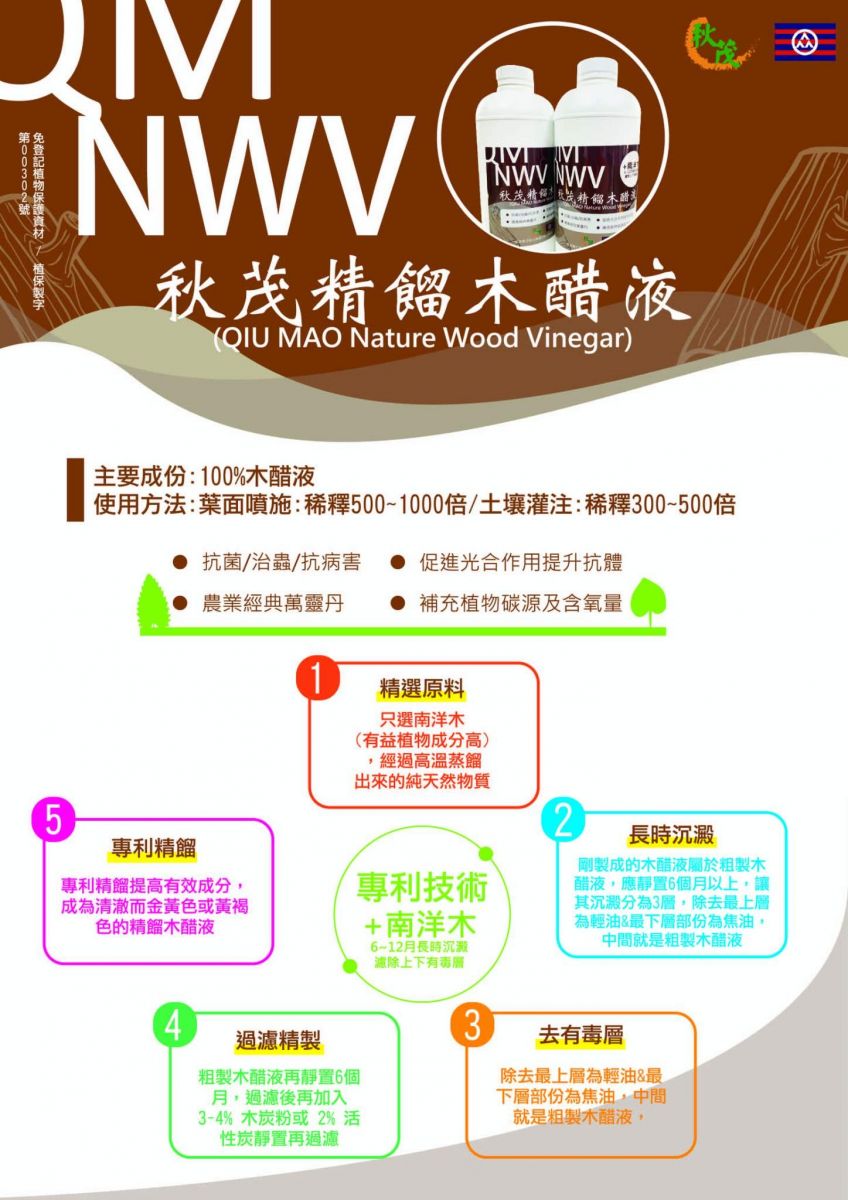 1)精餾木醋液:南洋木熱浸壓榨液再精餾,沉靜半年以上,去除上下層含毒物質而得。非煙燻冷凝,非只是醋酸,大量保有木材高官能基活性物質,於刺激作物生長及抗菌均有較為顯著之表現。