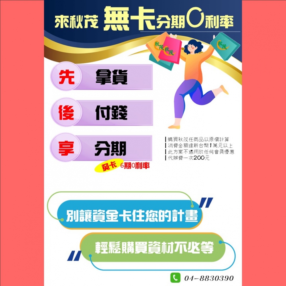 【新聞快報】【秋茂無卡分期0利率】秋茂因應大家各種需求,支付方式非常多元!現在更有先買後付再享分6期0利率! 這麼好康!不用帶錢就可以來購買資材啦!!