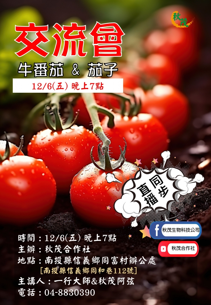 【新聞快報】秋茂牛番茄&茄子交流會12/6(五)晚上7點在南投信義!免費參加! 歡迎您的蒞臨!線上同步直播!