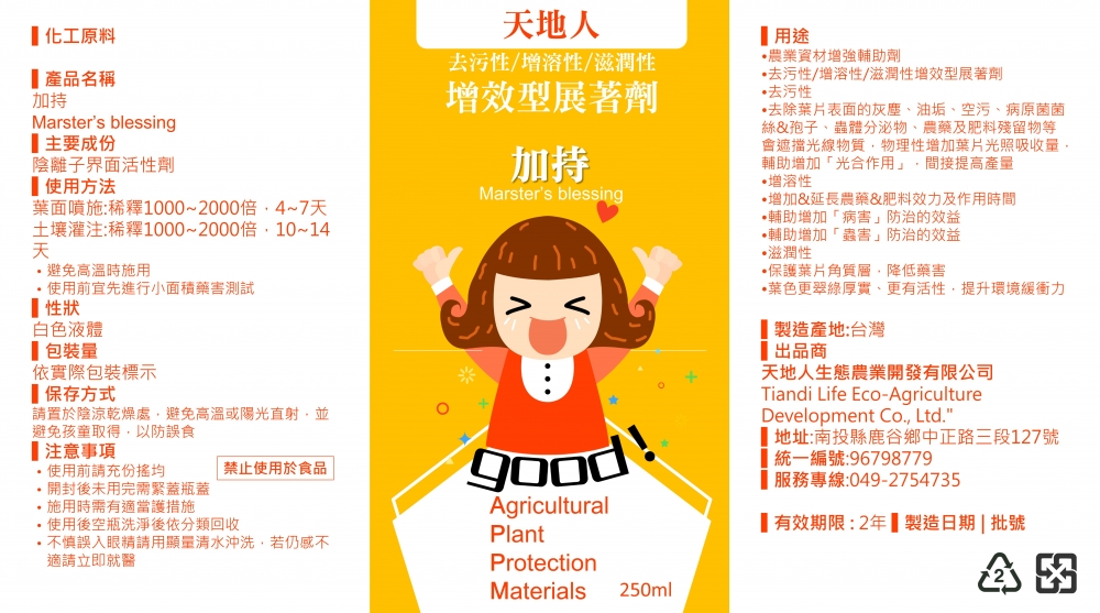 【資材研發】強調於「去污性/增溶性/滋潤性」增效型展著劑,農業資材增強輔助劑。去污性增加光合作用提高產量。增溶性增加&延長農藥&肥料效力及作用時間,輔助增加「病害」&「蟲害」防治的效益<特殊功能原料>